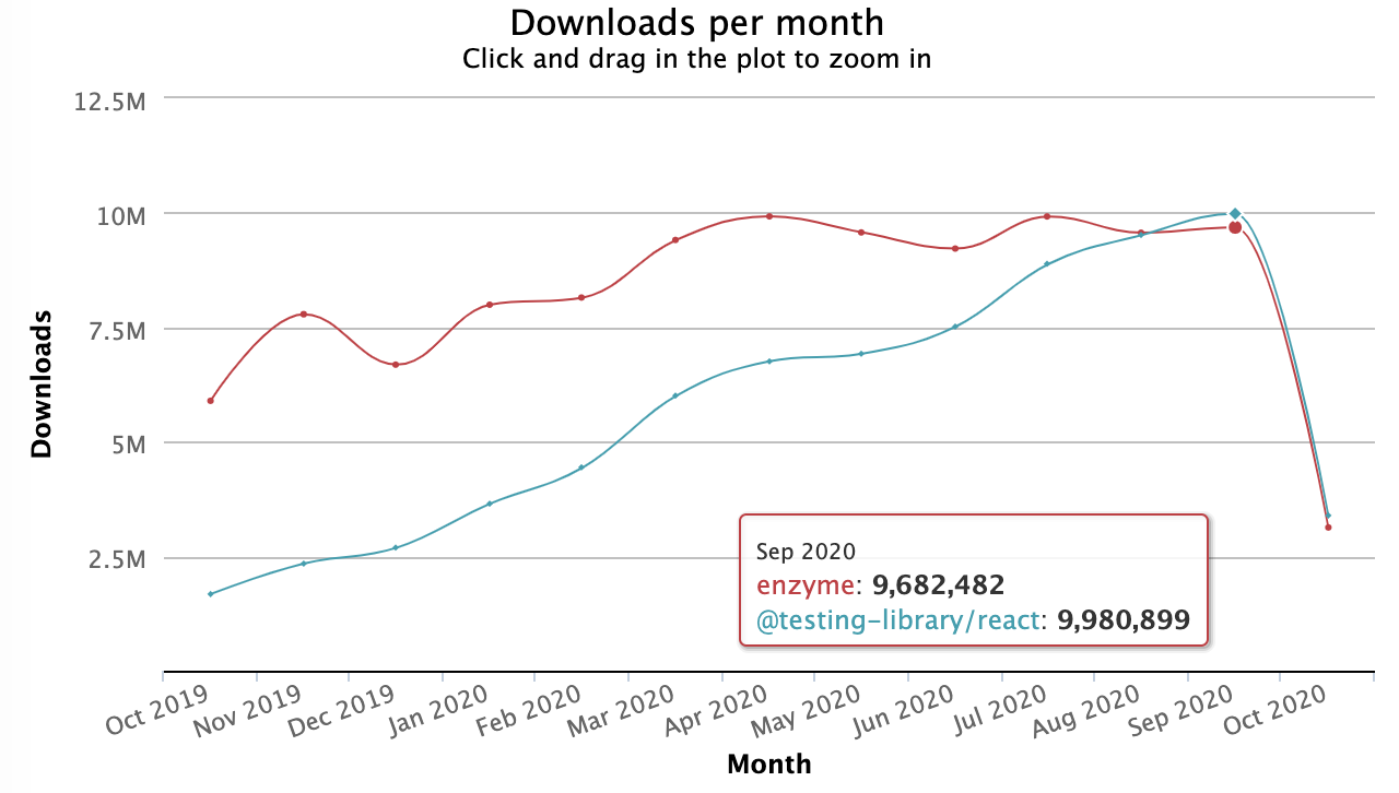 15 months ago, we introduced the very first test using the library (to replace enzyme). Last month, react-testing-library had more downloads than enzyme!